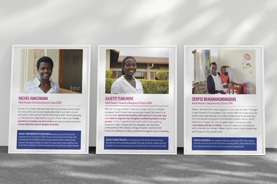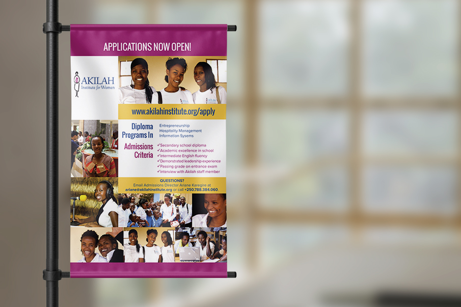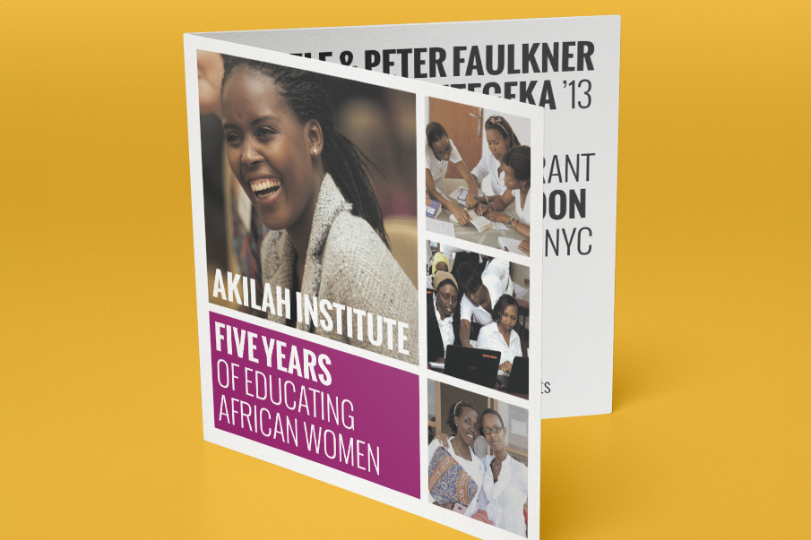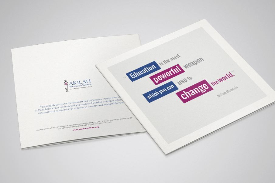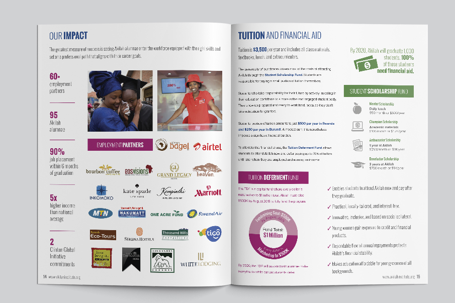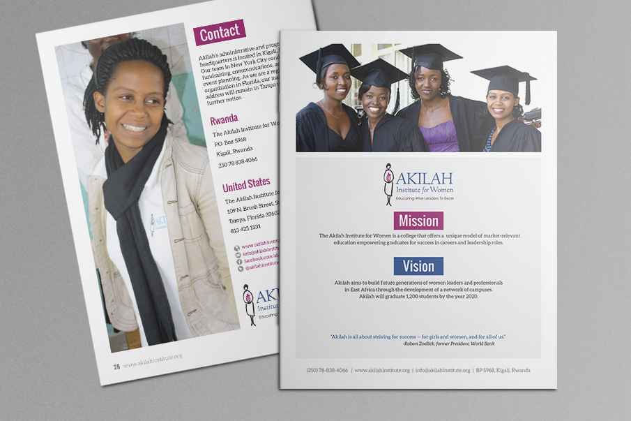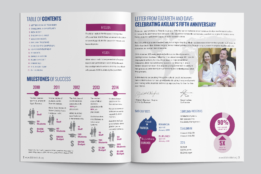 It’s been an honor to have helped with graphic design in the early years of Akilah Institute for women, and to witness this institution grow. Over the years I helped with variations on the logo, invitations to fundraising events, impact reports, anniversary materials, banners, flyers, booklets, infographics and more. This shows a selection of pages/pieces from a variety of projects.