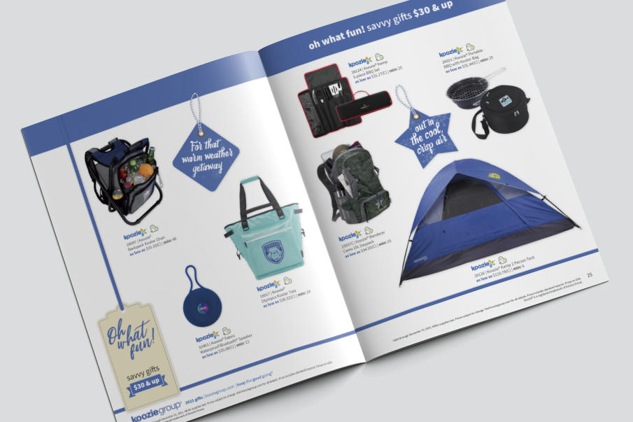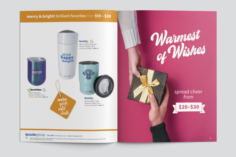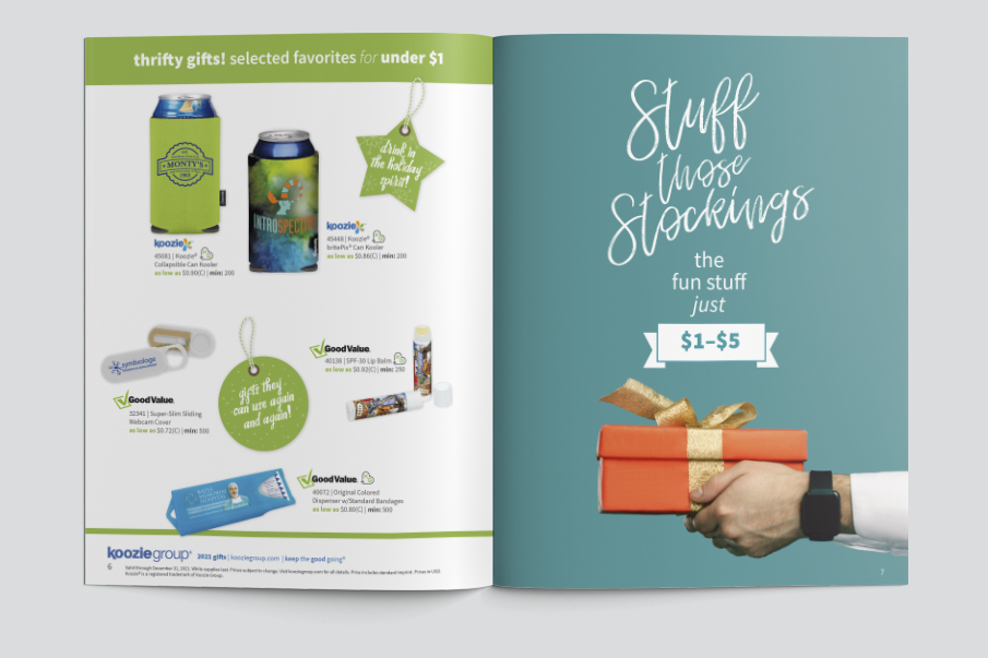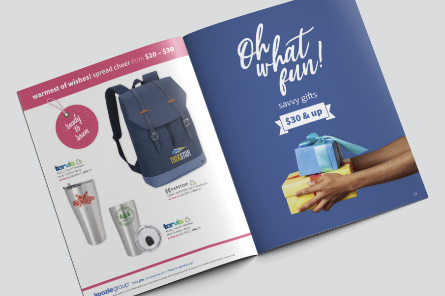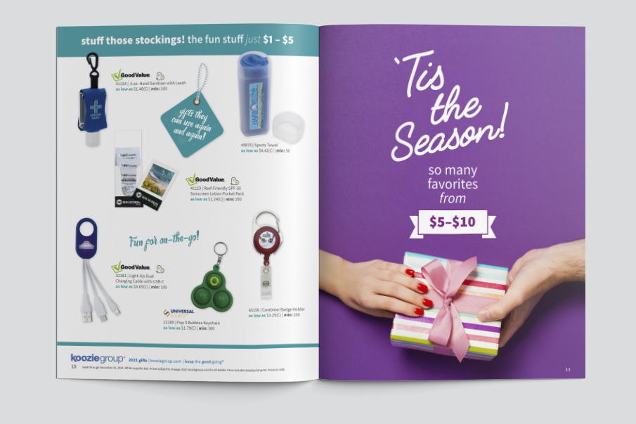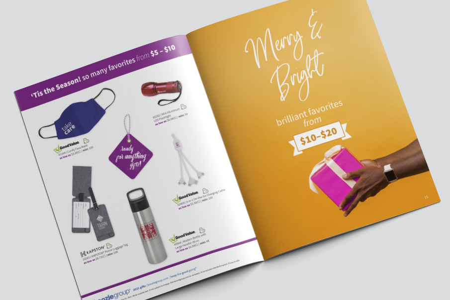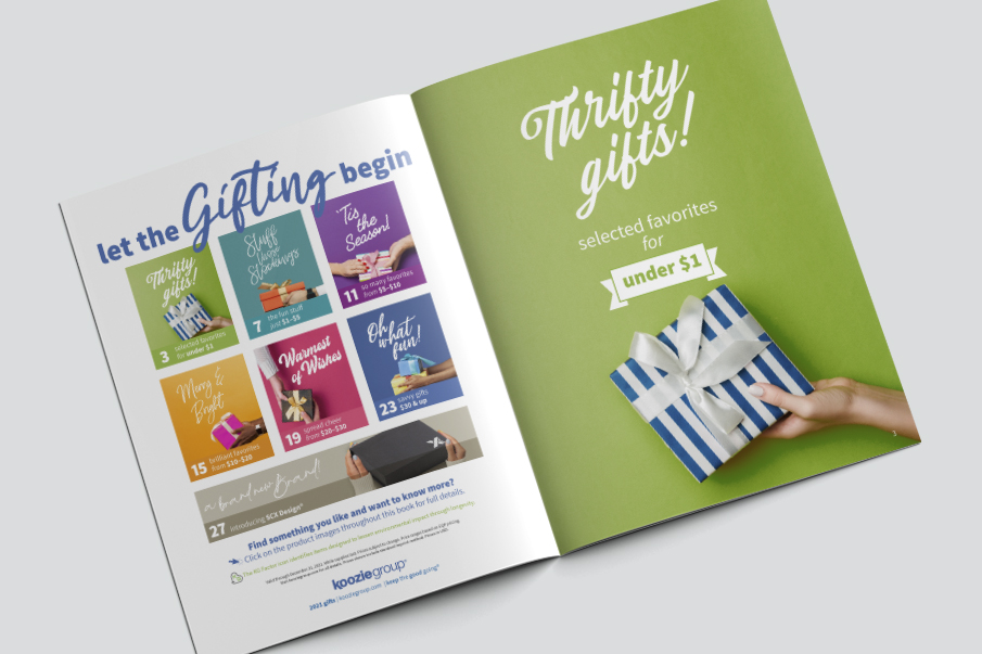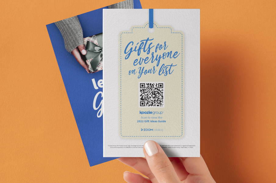 Printed gift guide booklet, organized into sections by price point, holiday-themed. Corresponding QR code card linking to electronic version, and corresponding social media/web graphics