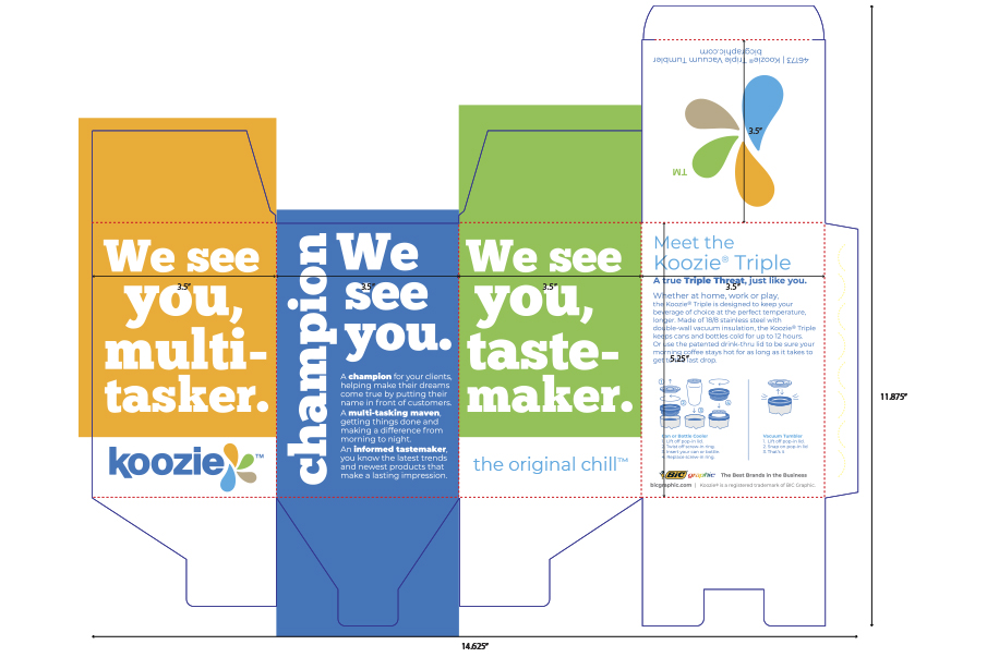 Part of the “You only THINK you know the Koozie® Brand” marketing campaign, this sample was direct-mailed to 700+ MOB’s (motivators on board – a group identified by the sales team as “champions” for BIC Graphic products and brands). This mailing included the newest product color at the time (white), and the Triple Vacuum Tumbler arrived to customers inside a custom box outlining the ways they were “triple threats” as multi-taskers, influencers, and champions for their clients. This was a hugely impactful mailer that received great feedback and converted into additional orders for both the Triple Vacuum Tumbler and the custom box.