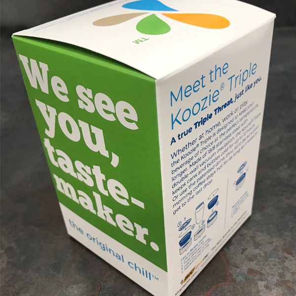 Part of the “You only THINK you know the Koozie® Brand” marketing campaign, this sample was direct-mailed to 700+ MOB’s (motivators on board – a group identified by the sales team as “champions” for BIC Graphic products and brands). This mailing included the newest product color at the time (white), and the Triple Vacuum Tumbler arrived to customers inside a custom box outlining the ways they were “triple threats” as multi-taskers, influencers, and champions for their clients. This was a hugely impactful mailer that received great feedback and converted into additional orders for both the Triple Vacuum Tumbler and the custom box.